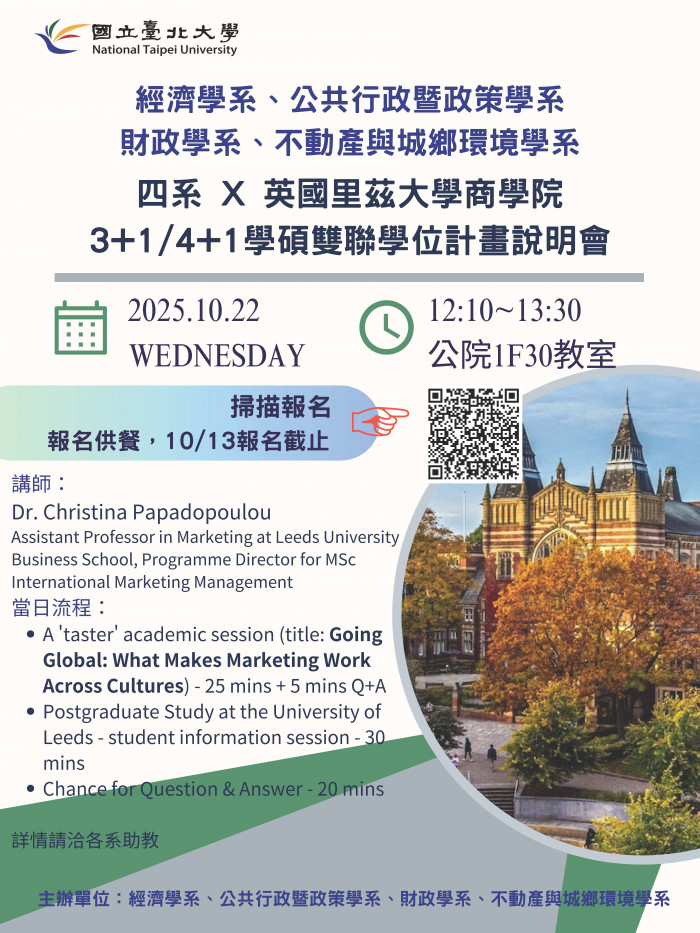 最新公告 九月 22 2025 114.10.22 里茲大學商學院3+1/4+1學碩雙聯學位計畫說明會 Google 表單網址:https://forms.gle/pCguLU6cCZEHnjz88 相關文件下載 四系與里茲大學商學院雙聯學位說明會1141022-2 (1).pdf