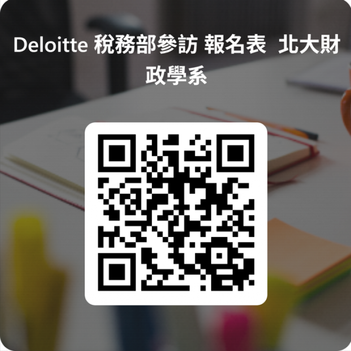Deloitte的Tax & Legal諮詢服務業務在四大會計師事務所居於領先地位,目前稅務與法律部門在台灣有600多位員工,為何可以吸引這麼多人才加入? 歡迎同學們來一窺我們的工作環境、科技創新,與國際接軌的人脈網絡以及投資在同仁的學習機會與福利。我們誠摯地邀您於12月12日下午到我們的台北辦公室參訪(南山微風大樓-台北市松仁路100號),親睹我們的工作環境,並與學長姐們喝喝下午茶暢聊工作經驗與職涯規劃。