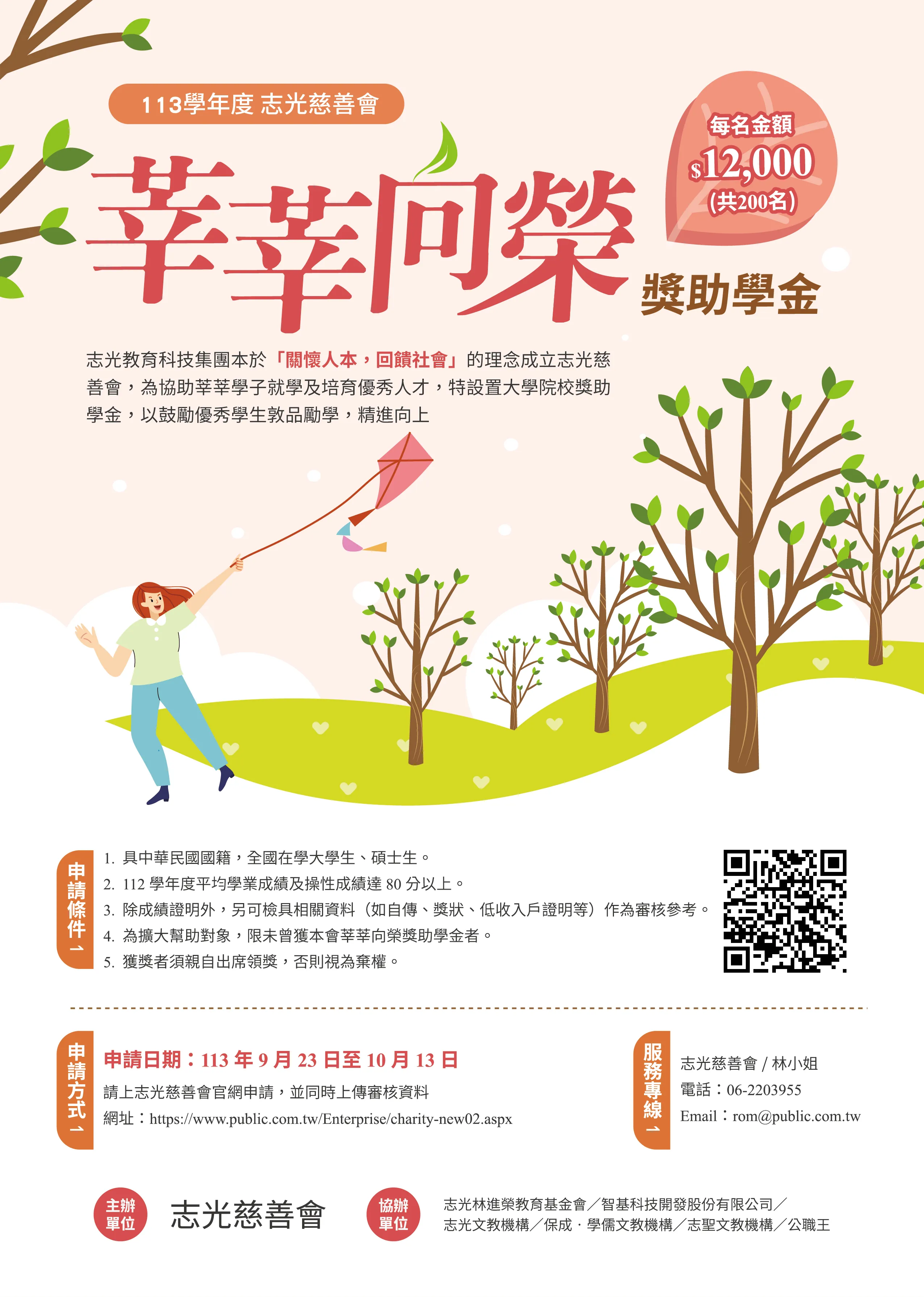 請於申請期間內至指定頁面申請,經審核後將擇期公布結果與頒獎https://pse.is/TNVKP檔案下載113志光慈善會莘莘向榮獎助學金申請海報.webpWEBP1130830-113學年度志光慈善會【莘莘向榮獎助學金】公文函及申請辦法-國立臺北大學財政系.docDOC113志光慈善會莘莘向榮獎助學金申請海報.webpWEBP1130830-113學年度志光慈善會【莘莘向榮獎助學金】公文函及申請辦法-國立臺北大學財政系.docDOC